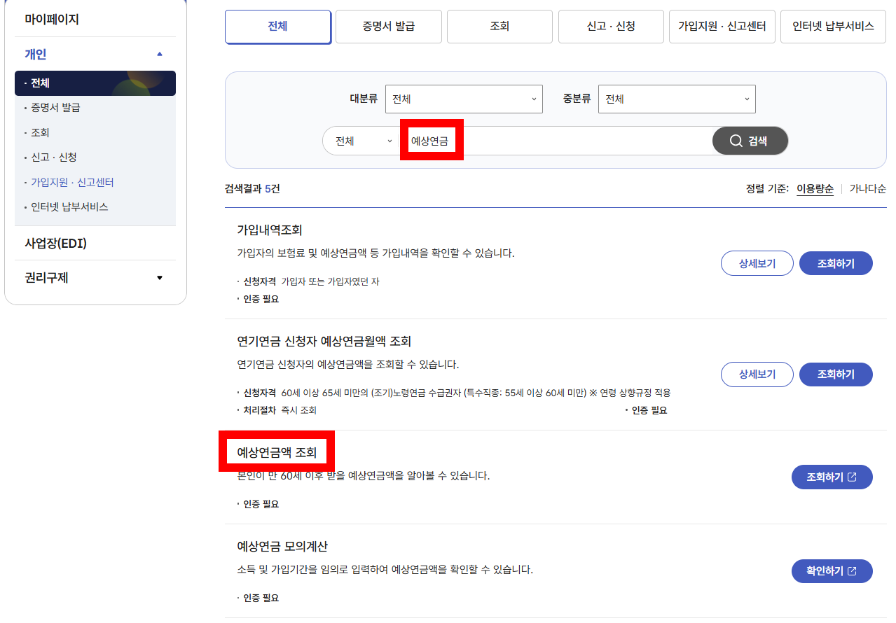 2. '개인서비스' 메뉴에서 '예상연금액 조회'를 선택합니다.