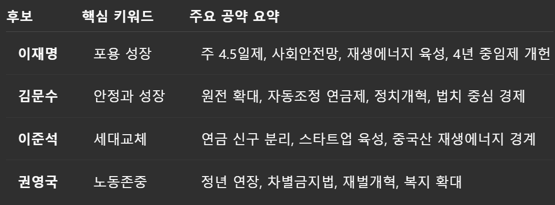 | 후보 | 사회 통합 비전 | 연금·의료 개혁 방안 | 위기 대응 전략 |