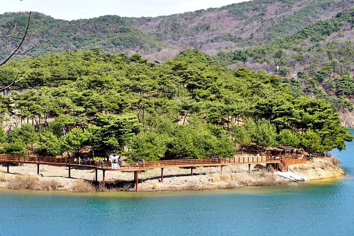 산막이옛길은 괴산호를 따라 조성된 아름다운 수변 둘레길입니다. 약 4km 길이의 길을 걷다 보면 고요한 호수와 숲이 만들어내는 자연의 아름다움에 빠지게 됩니다. 특히 여름철에는 길 양옆으로 울창한 나무가 그늘을 만들어 걷기에 더없이 좋습니다. 아이들과 함께 가더라도 부담 없이 걸을 수 있을 정도로 길이 잘 닦여 있으며, 곳곳에 전망대와 쉼터가 마련되어 사진 찍기에도 완벽한 곳입니다.
