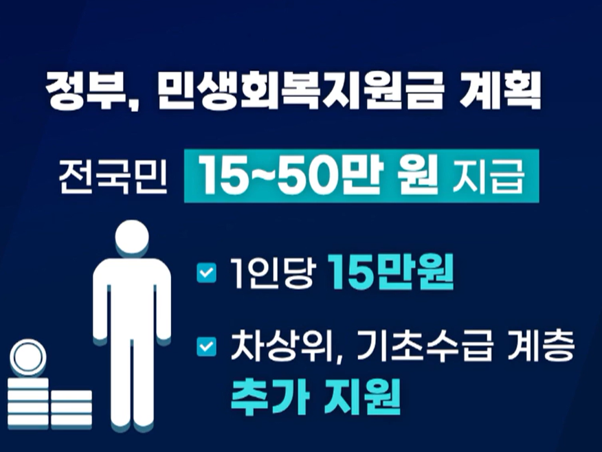 • 1차 지급: 전 국민에게 최소 15만 원 지급, 소득·지역 기준에 따라 최대 42만 원까지 차등지급
