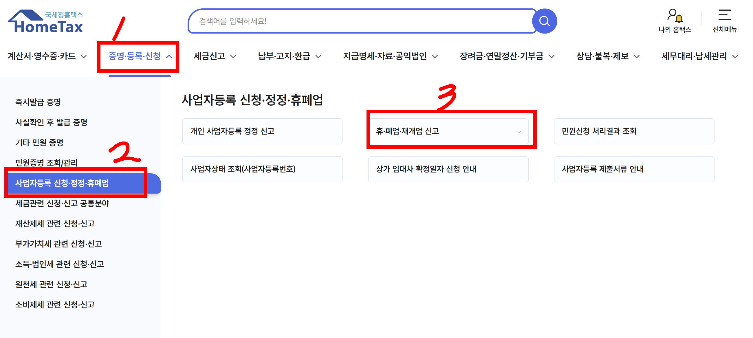 1. 증명 · 등록 신청 > 사업자등록 신청 · 정정 · 휴폐업 > 휴 · 폐업 · 재개업 신고