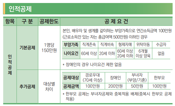 - 직계비속 : 만 20세 이하 / 1명당 연 150만 원