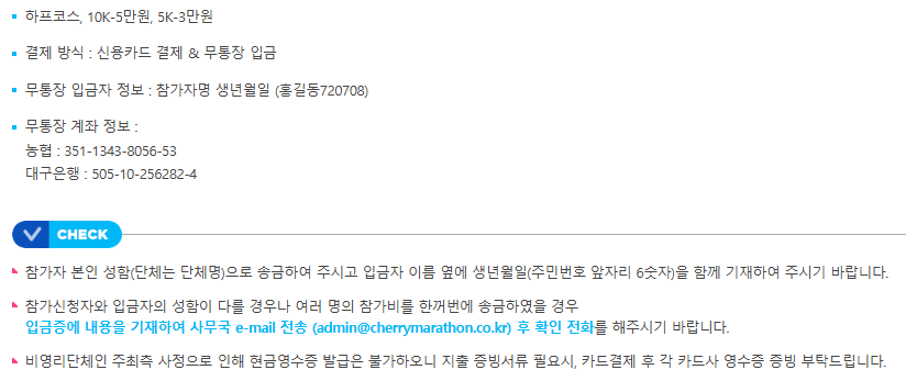 - 참가비 : 하프코스, 10km 각 50,000원 / 5km 30,000원