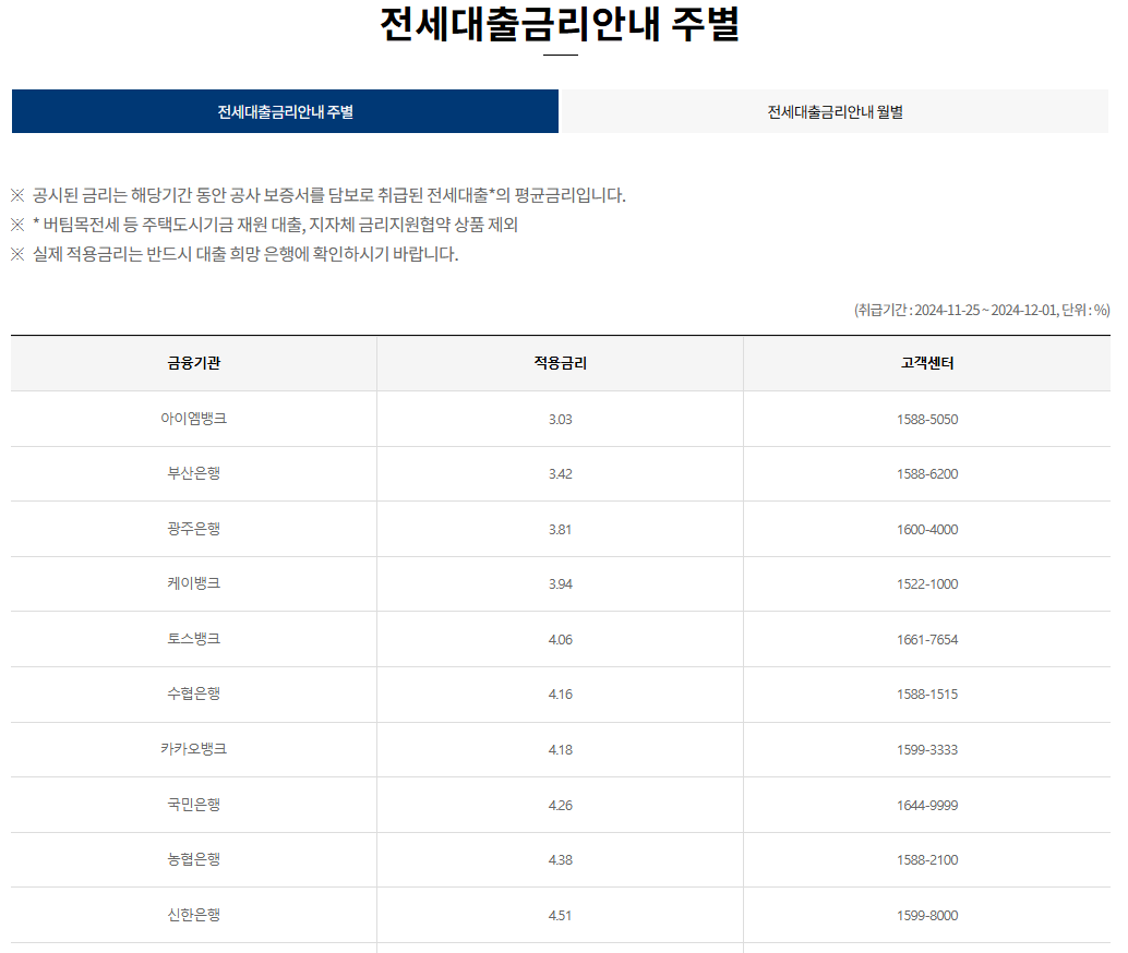 - 한국주택금융공사: 전세대출금리안내 페이지에서 금융기관별 전세대출 금리를 확인할 수 있습니다.