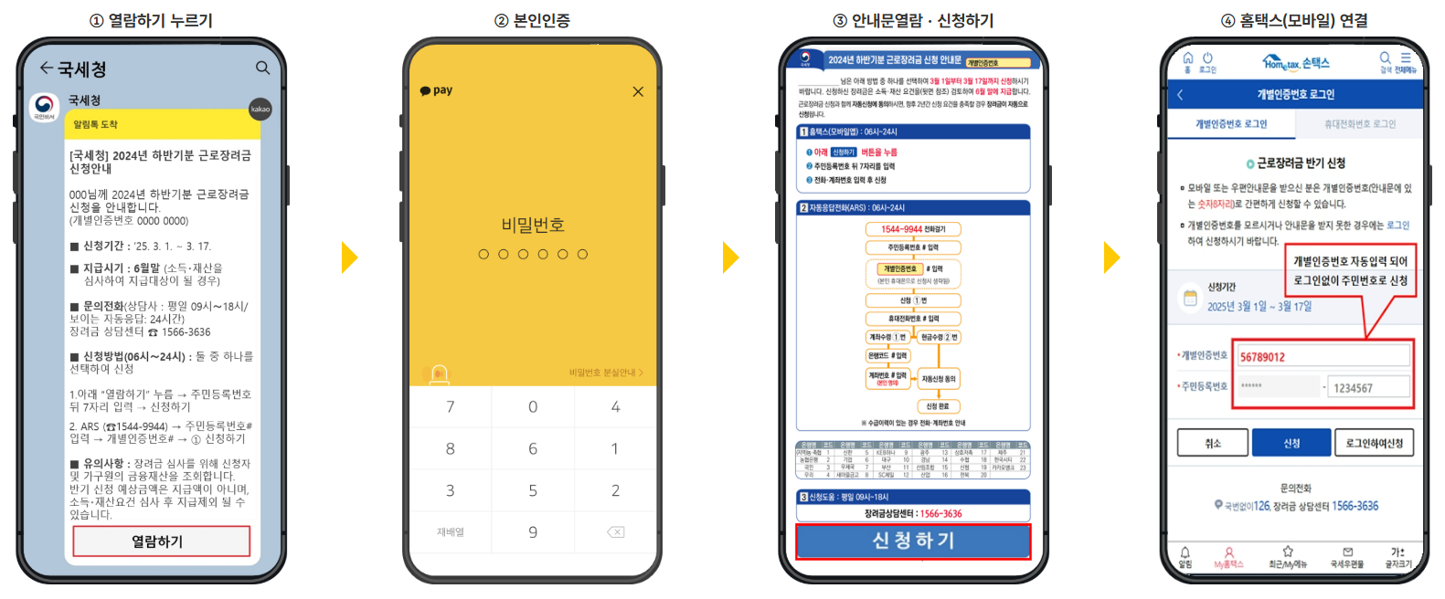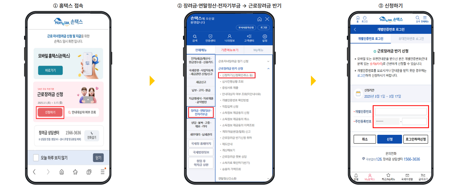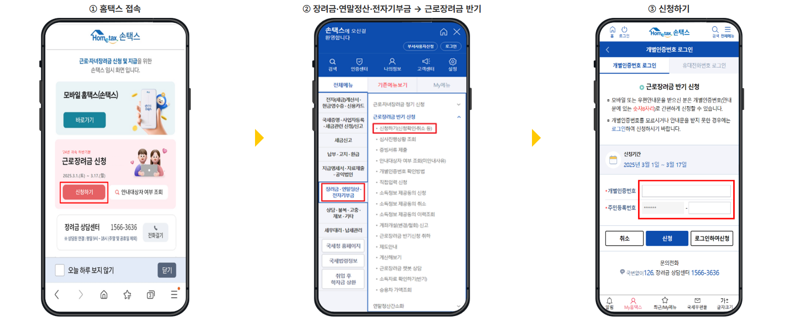 - 장려금 상담센터(1566-3636) 또는 세무서 : 전화하여 신청대리 서비스요청을 할 수 있습니다. 본인확인 후 신청이 가능하기 때문에 주민등록번호, 지급받을 본인 명의의 계좌번호 등을 사전에 준비하면 편리합니다.