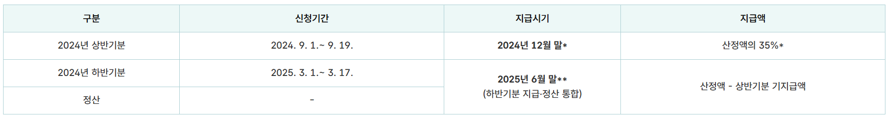 - 2024년 상반기분 신청기간은 2024.9.1~9.19이고 지급일은 2024년 12월 말입니다.