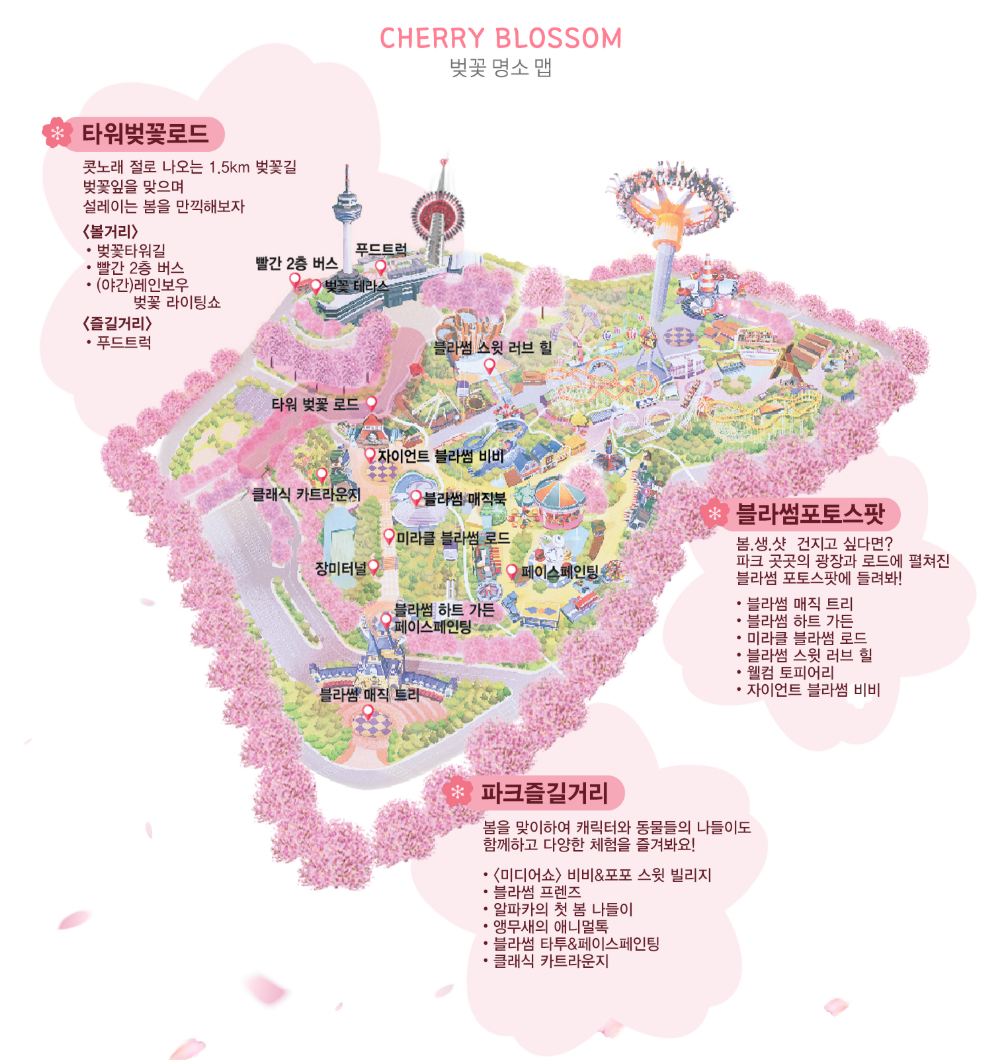 오직 테마파크에서만 볼 수 있는 벚꽃 회전목마는 사랑하는 사람과 꼭 사진 찍어야 할 포토스팟입니다. 회전목마와 벚꽃이 함께 만드는 로맨틱한 장면을 추억으로 남겨보세요.