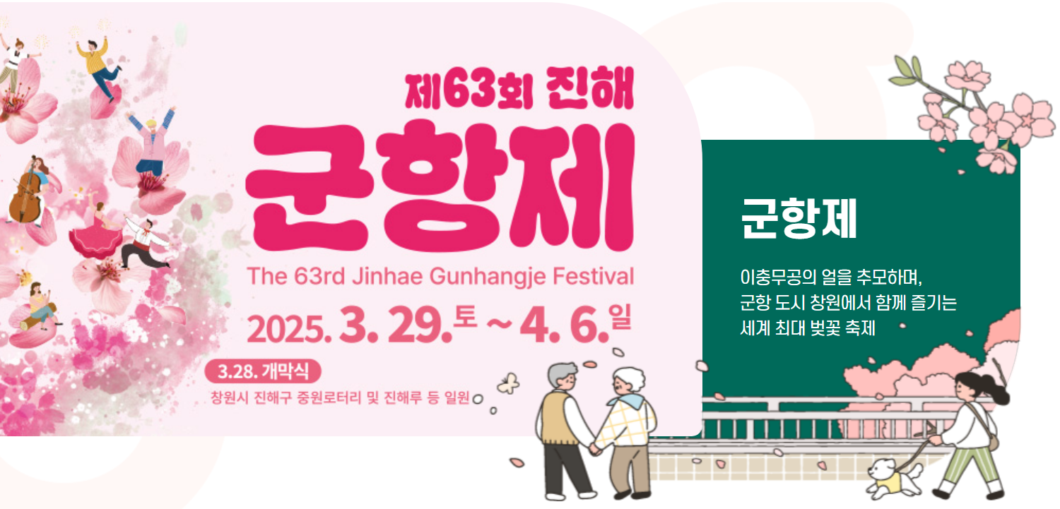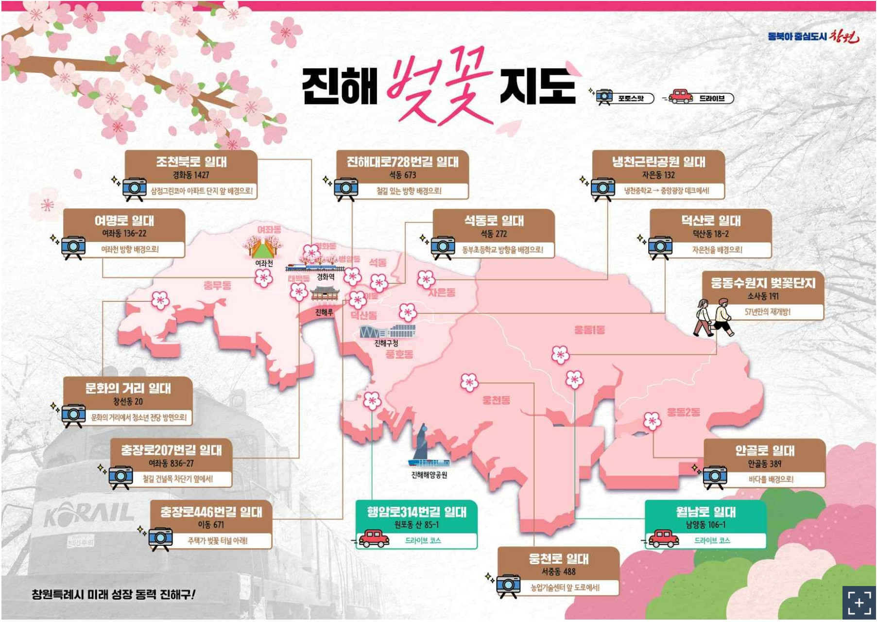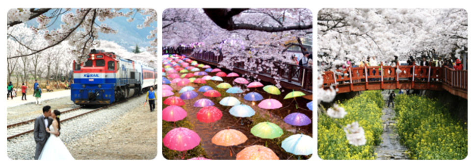 특징 : 진해 군항제는 국내 최대 규모의 벚꽃 축제로, 해군사관학교 개방과 여좌천 로망스 다리, 경화역 철길 벚꽃길 등이 유명합니다. 2025년 진해군항제에서는 웅동수원지 벚꽃단지를 57년 만의 재개방한다고 하니 꼭 들려보시길 바랍니다. 진해 군항제 벚꽃지도에 나온 군항제 포토스팟, 군항제 드라이브스팟을 참고하여 인생샷도 건져보시길 바랍니다.