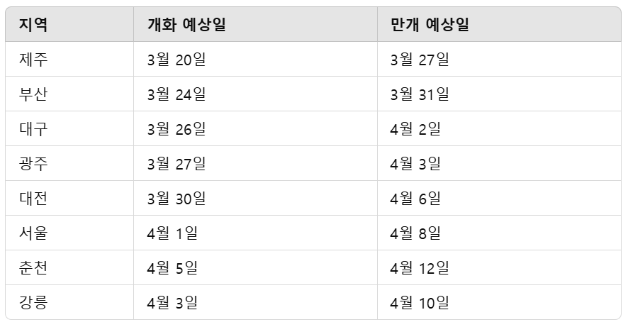 벚꽃 개화 시기는 매년 기온과 날씨 변화에 따라 조금씩 차이가 있습니다. 2025년은 평균 기온이 평년보다 약간 높을 것으로 예상되어 벚꽃이 예년과 비슷하거나 조금 이르게 필 가능성이 큽니다. 아래는 지역별 벚꽃 개화 예상 시기입니다.