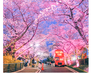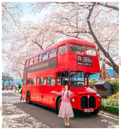 이월드 대표 벚꽃명소인 빨간 2층버스는 전국의 벚꽃투어리스트들이 필수로 찾는 포토스팟입니다. 벚꽃과 빨간 버스가 만드는 유럽에 여행 온 것 같은 이국적인 청취를 만끽해 보세요.