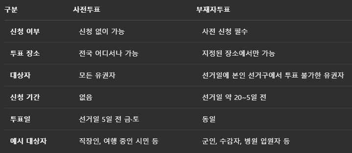 사전투표 기간에는 전국 어디서나 투표가 가능하지만, 부재자 투표는 정해진 장소에서만 진행되니 유의하세요.