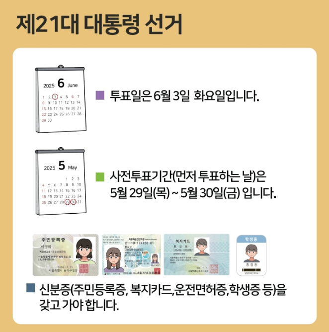 2025.05.11 - [시사상식] - 2025년 조기 대선 투표 방법 완벽 정리(투표소 위치, 사전투표, 유권자 필수정보까지)