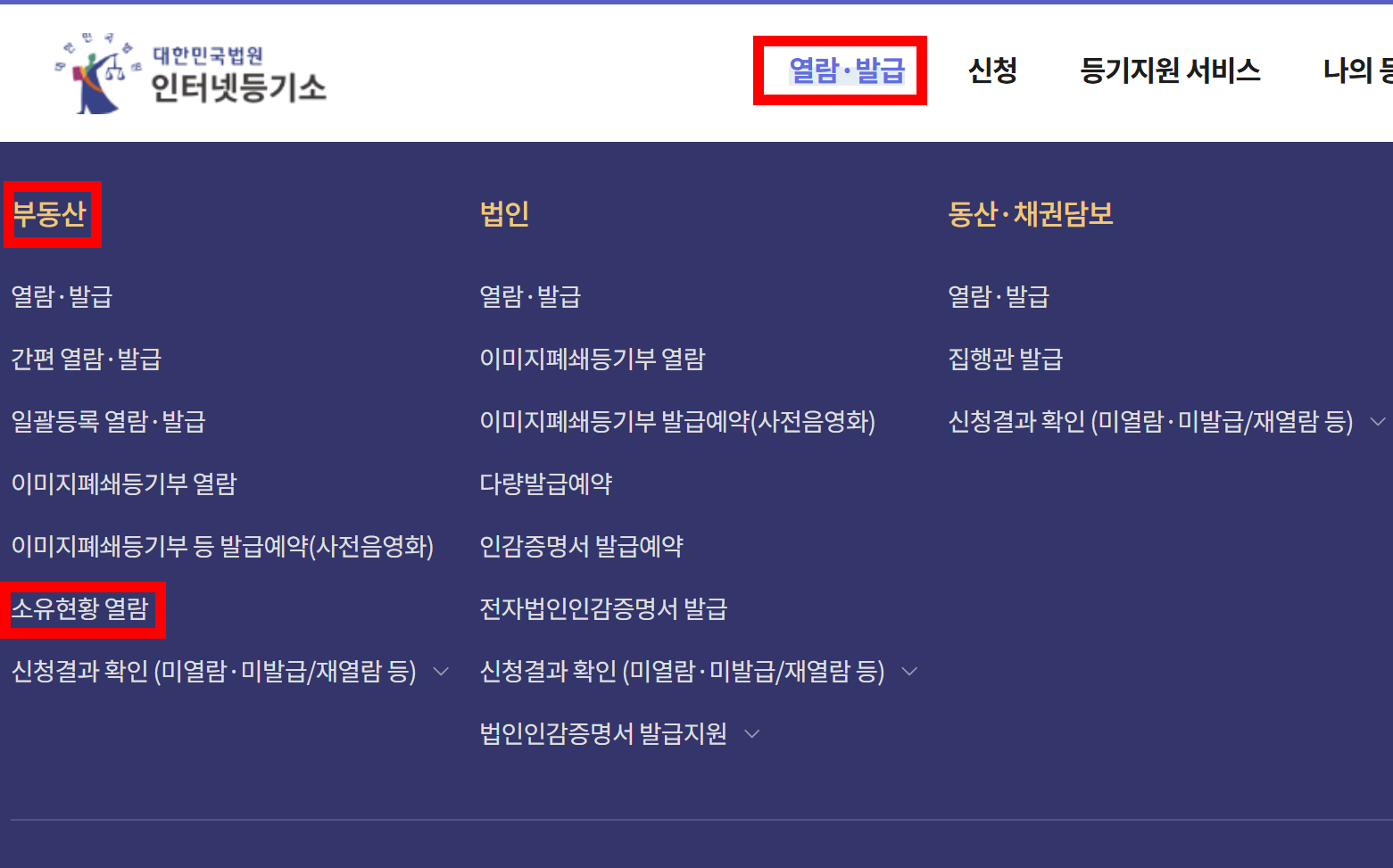 - '열람, 발급' > 부동산 > 소유현황 열람