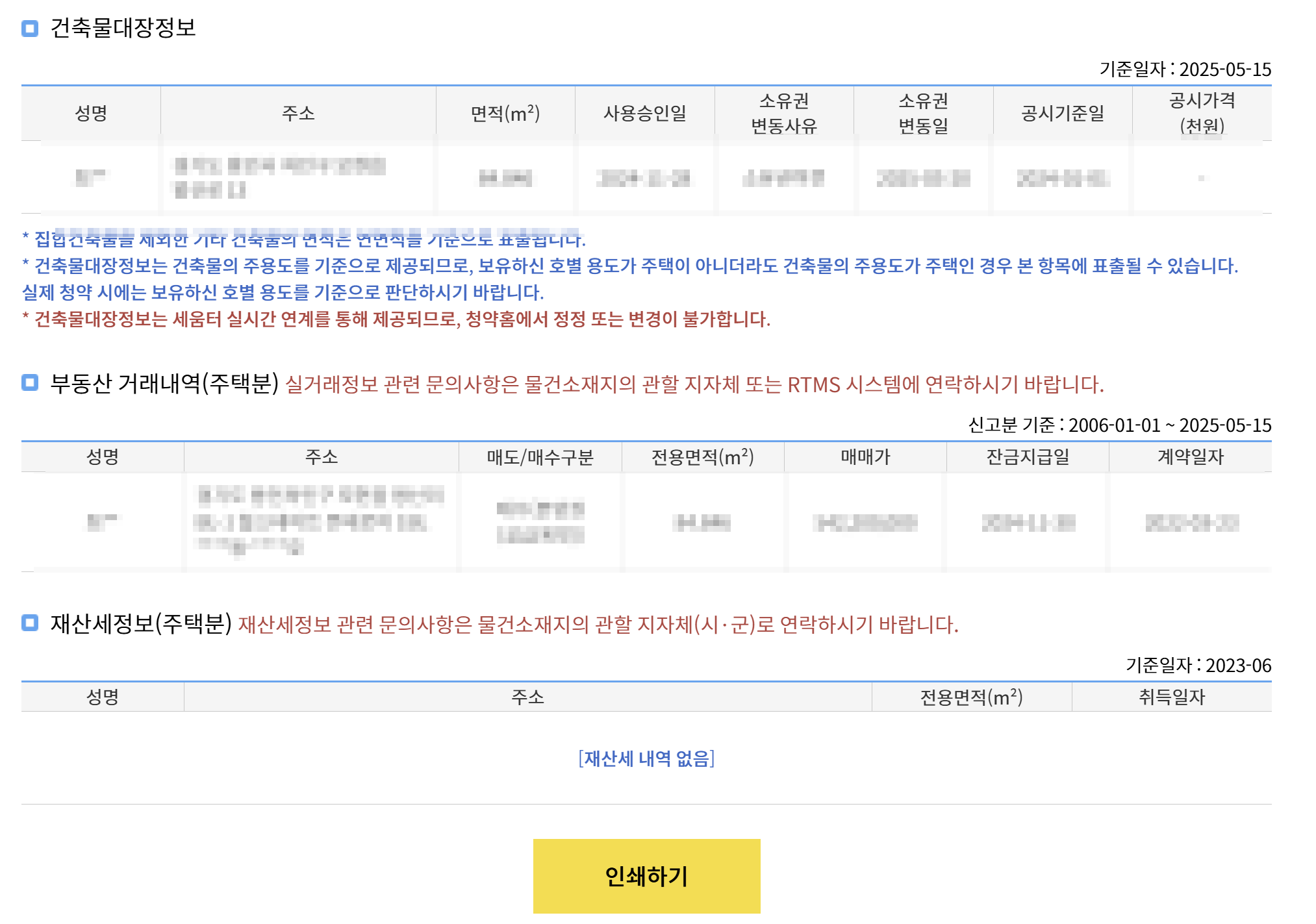 - 건축물대장정보, 부동산 거래내역(주택분), 재산세정보(주택분) 조회 가능